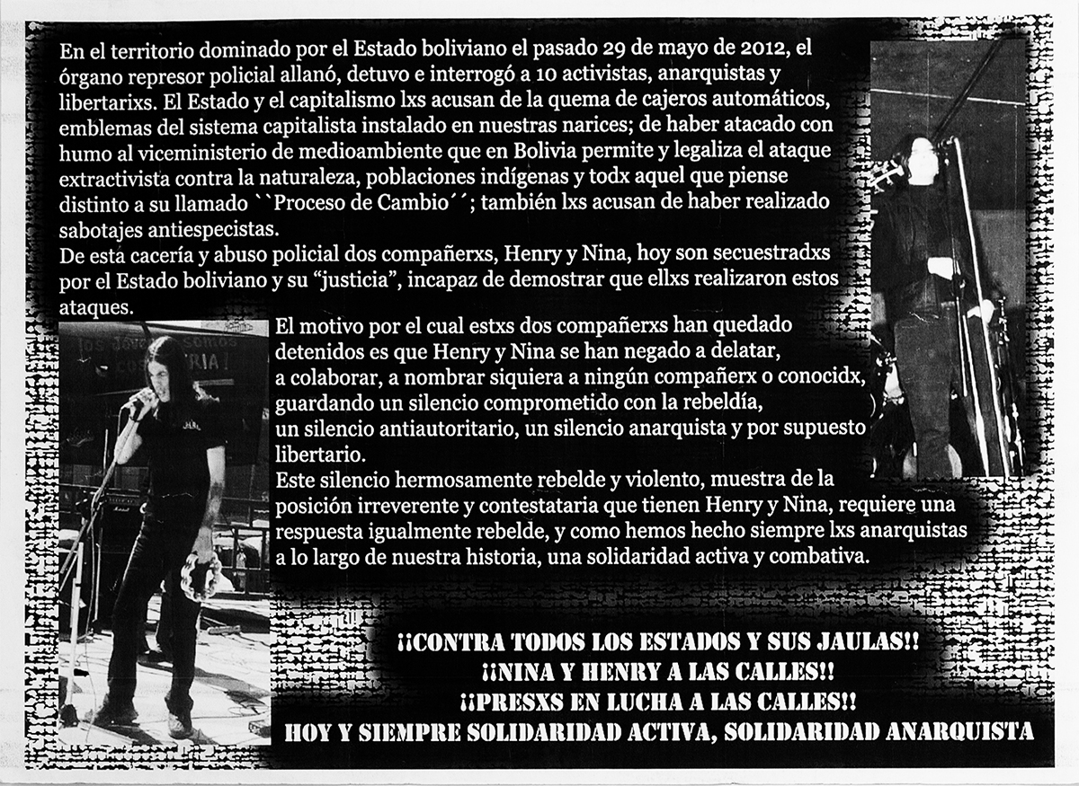 En el territorio dominado por el estado boliviano el pasado 29 de mayo de 2012, el órgano represor policial allanó, detuvo e interrogó a 10 activistas, anarquistas y libertarixs. El estado y el capitalismo lxs acusan de la quema de cajeros automáticos, emblemas del sistema capitalista instalado en nuestras narices; de haber atacado con humo al viceministerio de medioambiente que en Bolivia permite y legaliza el ataque extractivista contra la naturaleza, pobalciones indígenas y todx auqel que piense distinto a su llamado “Proceso de Cambio”; también lxs acusan de haber realizado sabotajes antiespecistas.